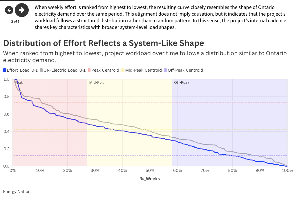 When weekly effort is ranked from highest to lowest and plotted as a continuous distribution over time, the resulting curve takes on a familiar shape. The highest levels of effort occur over a very small percentage of weeks. Effort then transitions through a middle range and extends into a long tail of lower-intensity weeks. This type of curve is well known in another domain: energy systems, where it is referred to as a load duration curve. And when compared to a normalized profile of Ontario electricity demand over the same period, the two curves align closely in overall shape.[3] Both exhibit a concentrated set of high-load conditions, a broad middle range, and an extended lower-load tail.[4]