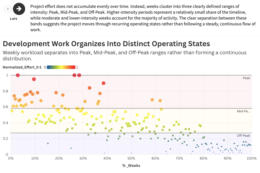This data pattern was initially explored in a previous article and data story in which I suggested that development is not best understood as operating at a steady baseline with occasional deviations. Instead, it appears to move through distinct operating states, each with its own characteristic level of effort.