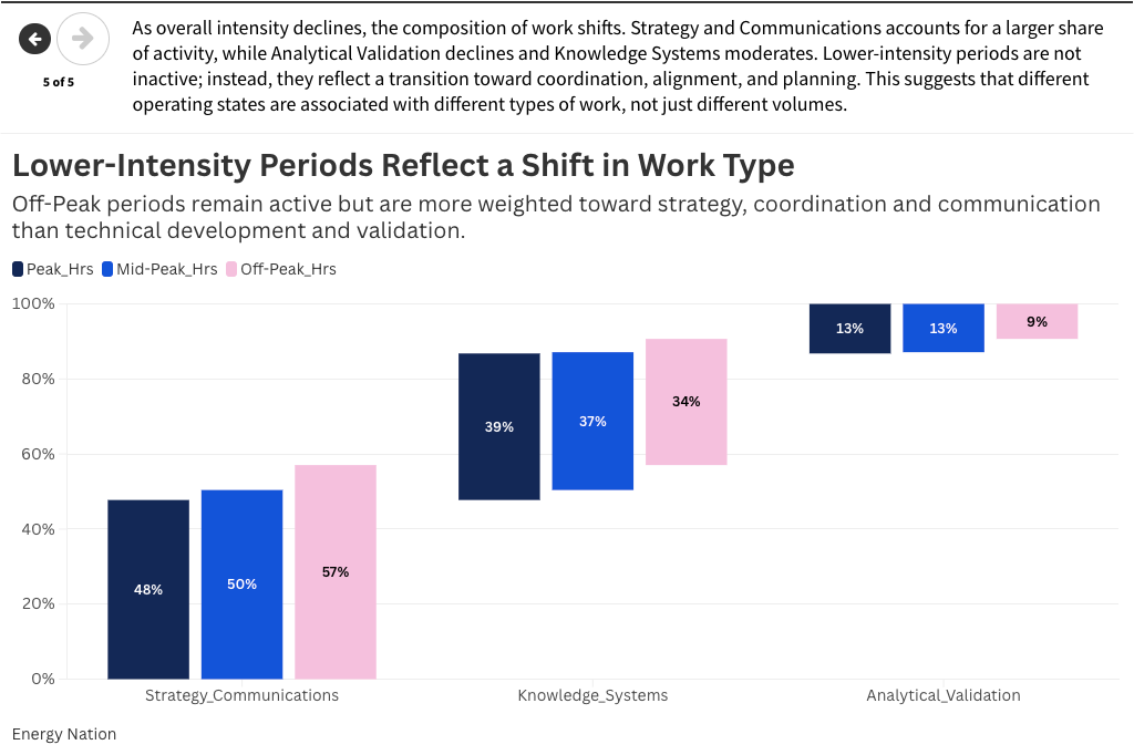 This shifting of work across bands indicates complexity, suggesting the system is non-linear, adaptive, and self-organizing. Lower-intensity periods are not simply mini versions of peak periods; they are qualitatively different. The project remains active, but the nature of that activity shifts from technical execution toward coordination, alignment, and preparation. Effort is not simply expanding and contracting in response to workload. It is reorganizing itself as conditions change, both in terms of who is doing the work and the type of work being done. This is where the energy system analogy can become useful.