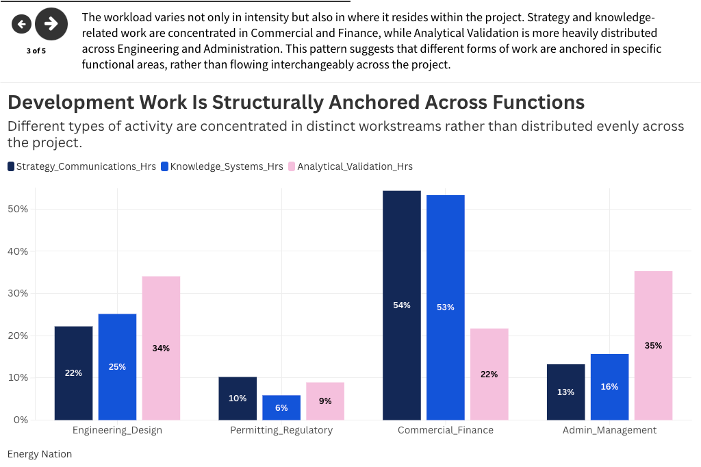 Strategy and knowledge-related work are carried primarily within the commercial-finance function, forming a centre of gravity. Analytical validation, by contrast, is more distributed, with a greater share falling within engineering-design and administration-management. This indicates that the project’s workload is not a homogeneous pool of effort, but rather a composition of distinct functional nodes, each responsible for different types of work.