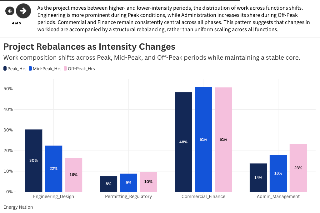 When this internal structure is examined alongside the band-based pattern of peak, mid-peak, and off-peak effort, a more complete picture of a system begins to emerge. As the project moves between these conditions, the distribution of work shifts across functions. Engineering-design is more prominent during higher-intensity periods, while administration-management increases its share during lower-intensity periods. At the same time, the mix of activities evolves. Strategy and communication-oriented work become more prominent as overall intensity declines, while knowledge- and validation-heavy work become less dominant.